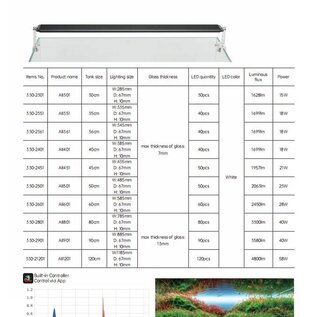 The A II series LED lights from Chihiros are specially designed for densely planted freshwater aquariums. Full-spectrum lamps cover a spectral range of approx. 400 - 700 nm, with strong focus on the red & blue spectrum without compromising green & yellow rays. The individual LEDs have a color temperature around 8.000 Kelvin & are arranged in 3 rows across the entire lamp to ensure a well-balanced illumination as to not cast any shadows.