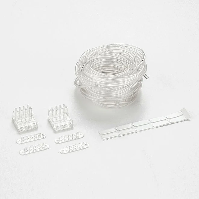 Contents: 10 meters of transparent tubing, 2 tube holders, 4 tube guides with double-sided adhesive strips.