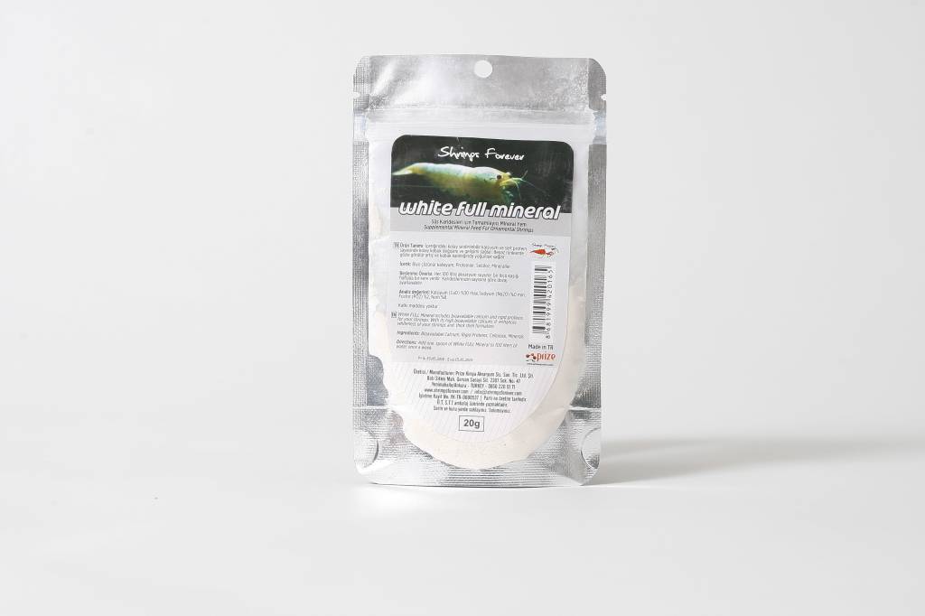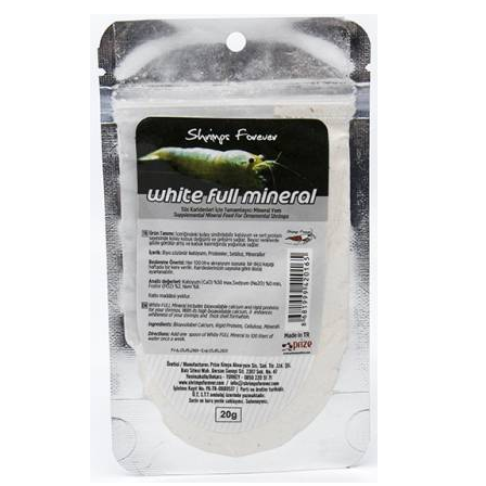 Shrimps Forever white full mineral is een rijke mix aan mineralen en ongebonden calcium. Deze ongebonden calcium is zeer gemakkelijk op te nemen door garnalen als aanvullende voeding en kleurversterker. Het calcium zorgt op een natuurlijke manier voor de toename en versterking van het witte pigment waardoor de witte kleur intenser wordt.