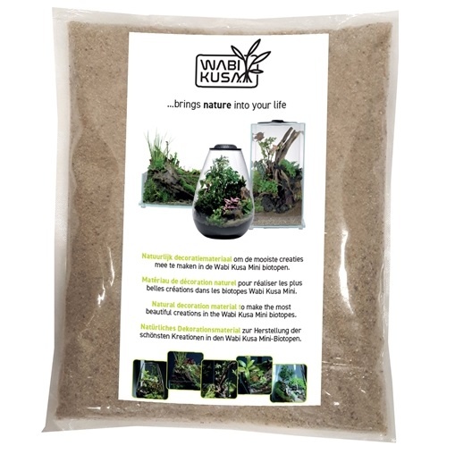 Wabi Kusa calcium sand is zand met een natuurlijke zandkleur en kan direct op de soil gebruikt worden. Calcium sand geeft de Wabi Kusa een natuurlijke uitstraling en is breed inzetbaar als bodembedekker. Dit zand is eigenlijk kwartsgrind met een hele fijne afmeting. Hierdoor is de korrel veilig voor alle bodembewoners, heeft geen invloed op de waterwaarden en behoudt het altijd zijn kleur!